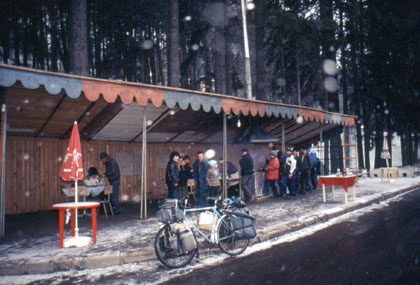 ルーマニア ブラショフで。 ![]() この日目指したのはプロイエシュティと言う街。ブラショフの町を後にすると、カルパティア山脈越えが待っていた。と言っても標高はたったの1033m。この時期なら雪が降り積もっているかもしれないと予測したものの、それ程高くも無ければ厳しい峠越えでもなかった。わずか4時間ほど走ると頂上に到着。峠の山頂に着く頃には雪がちらちら。頂上付近はリゾート地で、ホテルやペンション等が立ち並び、まるでルーマニアではないような雰囲気だ。 長い緩やかな下りを走っている途中、道沿いに屋台のような食事処を見つけた。 「おお、これは例のケバブチェとかいう・・・」 私は雪の中の走行を中断し、レストランに直行。寒い中で立ち食いするこのケバブチェは病み付きになりそうだ。雪の中を走ってきただけに熱々の肉にパン、そしてコーヒーがたまらなく美味く、胃袋に入っていくと、再び走る元気が湧いて出るようだった。立ち食いは締めて300円。