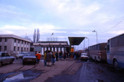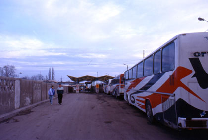 ルーマニア 長いバスの列を横目にブルガリア国境へ急ぐ。 ![]() 順番を待つバスや車を横目に、私はスイスイと走り過ぎ、オフィスに到着。歩行者用の通路に移って、そこで出国スタンプをもらった。