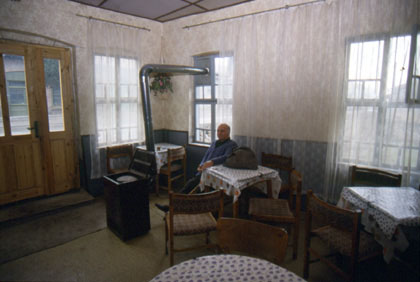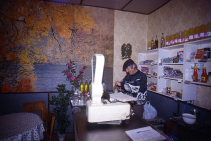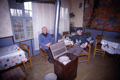 ブルガリア 約1100円ほどの宿で。 ![]() 翌朝、ホテルのすぐ近くにあったファーストフード屋台でホットドッグとコーヒーを腹に詰め込んで朝食。 走り出してしばらくすると、国道沿いにレストランのような小さな店を見つけたので寄ってみた。店内はとてもほのぼのとした感じで、机に椅子、ストーブなどが置いてある。少し古臭くて、店全体に何十年か前の昔風の雰囲気が漂っていた。 「こう言うところって落ち着くなあ。」 私は早速椅子に腰掛け、コーヒーを頼んで一休みした。30分も店に座っていると、走行の疲れもとれ、精神的にとてもリラックスできる。しばらく休んだので、店内の様子を撮らせてもらい、再び走り始めることにした。