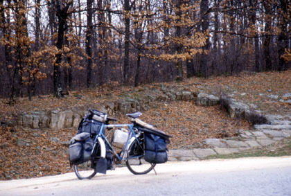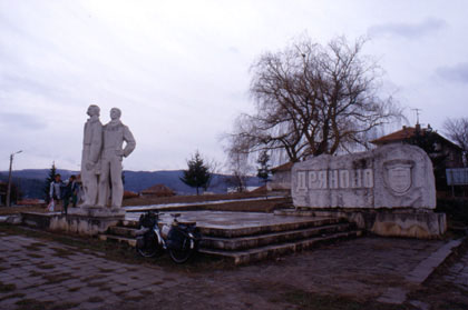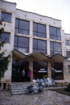 ブルガリア 旧ソ連や社会主義国で良く見る似たような形のモニュメント。 ![]() 5時近くから街の宿を探し歩いた。しかしこのガブロボの街には高級ホテルしか存在していないようで、聞けば値段はシングルで50ドル。ぶったまげてしまう。 「もっと安い部屋はありませんか?」 と聞くと、 「ないです。」 「・・・これはまた弱ったもんだなあ。」 レセプションのおばさんに、他の安宿があったら教えて欲しいと聞くと、 「10kmほど南に行った谷間にプライベートホテルがあります。」 「ここから10km南だって?」 その宿は10ドル位だと言う。10ドルはいいが、更に山道を上って10kmというのは問題だ。そのプライベートホテルがあるのはどうも山脈の峠の途中らしい。 「もうひとふんばり走るか・・・。」 再びカッパを着てペダルを踏み出す事にする。これなら食料を買い込んで野宿した方が良かったか。 周囲は真っ暗になっていたが、10kmほど緩やかな坂道を走ると道沿いに看板が見えた。 「ここか・・・」 宿までもう少しという所でうまい具合にパンク。これが峠の上り途中でなくて本当に良かった。 宿は小さなペンションのような造りで、今までのブルガリア走行中にはあまり多く見なかった現代風の家。宿の名前は「ホテルコロナ」と言う。峠の途中の田舎の峡谷にあり、ペンションのような感じで、主人の名はボギーさん。そして奥さん、更に可愛い娘さんもおり、家族経営をしているようだった。こんなきれいで近代的な宿が10ドル。びっくりしたのは朝食と夕食も付いていた事。