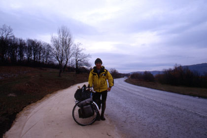 ブルガリア 何にも無い場所・・・でも私にとっては6万kmという記念すべき場所。 ![]() 「アイスランドからすでに1万kmか・・・。」 当初の計画ではヨーロッパ全土を8ケ月かけて、1万5000kmを走るつもりでいたから、かなり甘く見積もりすぎた。物価の高い国もガンガンと走ってしまったので、時間も費用もオーバー気味。それにまだまだ欧州は走る国が残っているから3万km位までは行ってしまいそうだ。 これから先の中東、アフリカ、アジアまでの全工程を考えると、最後まで本当に辿り付けるのかとちょっと焦ったりもする。 「とにかく6万km達成。目標まではあと4万kmだ。」 1万、2万、5万km、50カ国走破と記録を更新してきたが、出発前に私自身この数字を見たらすごい・・・と思ったに違いない。しかし実際に走ってみると、日々コツコツとペダルを踏んできた積み重ね以外の何物でもなかったような気がする。ペルーで出会った藤原さんが言っていた。 「いくら強気で肩肘張っても3日で世界一周はできまへんで・・・」 と。3日で世界一周は出来ない、藤原さんの言う通り、ゆっくりコツコツと進んで行けば良い。そうすればいつかは必ず着ける。堅実な歩みが目標への一番の近道なのかも知れない。6万km地点を通過しながら過去の歩み、これからの道のりの事を考えた。 ブルガリアの産業の中心地と呼ばれるガブロボの街に着く頃には、私も結構へたばっていた。街の入り口にある「ガブロボ」という街の名を見たときは、 「やっと着いた。うっとおしい雨からもこれで解放される、今日は6万km突破記念だ・・・。」 と喜んだ。