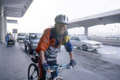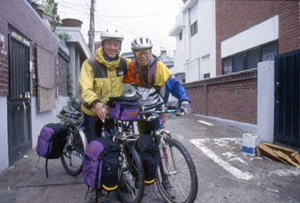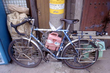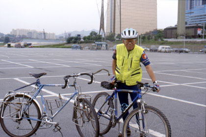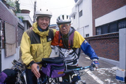 韓国 電柱に鍵をかけて自転車をおいたのだが、地元の人が丁寧に紐で縛ってくれてあった。これには感激。 ![]() 結局、2泊3日のソウル近郊サイクリングで私の韓国語の語彙は増えず終い。レパートリーは、「こんにちは。いくらですか。もしもし。ありがとう。」それだけで終わってしまった。これでは情けないと言うほかない。 こうして、ハングル文字と格闘したソウル近郊3日間サイクリングは終わった。世界一周の最後の訪問国である韓国で、気合いを入れて走らなければならなかったのに、逆に気が抜けてしまった。反省。それでもソウルに向かって走ったこの日は、漢江に沿って116kmを走り、初日に泊まった安宿に舞い戻った。 翌日5月10日。帰国前に日本の両親に連絡を入れた。 「5月12日には日本へ戻るから・・・。」 そう言うと、 「JACC(日本アドベンチャーサイクリストクラブ)の池元さんから連絡が入って、連絡欲しいって。」 そう言ったので早速大阪の池本さんに電話をした。すると、 「ソウルにね、自転車好きな張さんて言うスゴイ爺さんがいるんよ。ちょっと電話を入れてみたらいいよ。こっちからも連絡しとくから。きっと歓迎してくれるよ。」 私はこの晩、張さんに電話を入れた。彼は日本語ペラペラだと言うので心配はないと池本さんも言った。 「あー、もしもし?」 私は日本語で言った。すると本人が電話口に出た。 「おお、待井君か?君は今どこにおるかねえ。すぐ迎えに行くから住所を教えなさい。」 それは、耳をつんざくようなでかい声。びっくり。受話器から耳を少し離してしまったほどだった。電話連絡をしたのは夜の9時過ぎだというのに、張さんの行動は素早く、あっという間に地下鉄を使って私の泊まっている宿までやって来た。 「こんばんは。待井君かい?これから私の家へ来るんだ。いいね。」 「へ?今からですか。でも宿代を払ってしまったんですが。」 そう言うと、 「そんなものはいい、私が返してもらうから、大丈夫だ。心配するな。」 と一言。強引と言うのか、元気過ぎると言うのか、とにかくバイタリティー溢れる爺さんだった。彼の名は張永憲(チャンイヨンヒヨン)さん。私は「チョウさん」と呼ばせていただいた。年令は70歳を過ぎている。日本語はペラペラなので何も困ることはなかった。とにかく荷物をまとめて、張さん宅に移動開始。ところが、凄かったのは宿を出てからだった。 「自転車はどうやって持って行くのですか。」 「決まっとる。そのまま地下鉄に乗せればいいんじゃよ。」 酒はめったに飲まないと言うチョウさんだが、このときは飲んでいるのではないか?と疑ってしまった。改札口もなんのその。飛脚号には荷物が付いたままなのだが、それを二人で、 「せーの、よっこらせ。」 と持ち上げ、ソウルの地下鉄に飛脚号を乗せた。まるで日本のような地下鉄なので、たとえお隣の国と言っても私は恥ずかしくて赤面状態。それに張さんの日本語の話声のでかいことと言ったらない。何だかスゴイ人に出会ったなあ、と思いながら移動していると、時刻は真夜中の12時に。 張さん宅は高級住宅街にあった。警察官だったという張さんは、現役でフルマラソン、42.195kmをこなす超鉄人。部屋にはその完走メダルが山と飾られていた。どうやらとんでもない人らしい。それにしてもこんな元気印の凄い爺さん、今まで世界中にいただろうか。私は最後の訪問国でスゴイ人に出会えたと嬉しくなった。この晩は張さんの部屋でお酒を頂いた。
