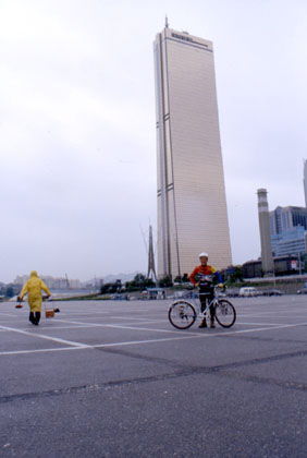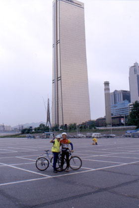 韓国 高いビルを背景に早朝サイクリングの記念写真を撮った。 ![]()