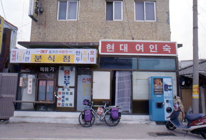 韓国 春川で泊まった宿。 ![]() 翌日、春川から原州を目指し走った。しかし、南端の釜山まで走るのではなく、ソウル近郊1周となるとどうも気合いは入らなかった。それに、走りながらどうしても日本への帰国のことがずっと頭から離れずにいた。 「本当に日本に帰国するのか・・・。日本は変わってしまったんだろうか。オヤジとお袋は元気かな・・・。兄貴のフィアンセってどんな人なんだろう。」 気合いは入らず、その思いは写真の枚数にも表れていた。走行中はほとんど写真を撮ることもなかった。なんともったいない。 この日は洪川までの約70kmを走り、街の安宿を探した。ホテルなのか食堂なのか民家なのか、ハングル文字を読めない私には宿探しも大変。ようやく宿泊所らしき宿を見つけてお願いしたのだった。