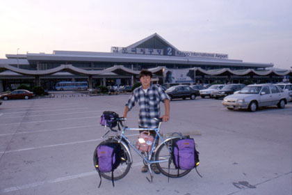 5月4日。私が乗った大韓航空622便は、無事ソウルの金浦国際空港に降り立った。 「いよいよ韓国だ。」 他の乗客の列に混じってイミグレーションに進んで行くが、周囲にそれとなくあるハングル文字の看板が気になってしょうがない。韓国語も分からなければ、ハングル文字も読めない。以前中国を走った時のように筆談は通じるのか。未知のハングル文字を頭に思い浮かべると、韓国走行に不安がなくもなかった。 入国審査官にパスポートを渡すと、当たり前のようにポンと入国印を押してくれた。 「これで117カ国目の韓国に無事入国だ。」 自転車と荷物を受け取り空港ロビーに出るが、金浦空港には落ち着いた雰囲気が漂っていた。数時間前までいたマニラの喧噪が嘘のようだ。 空港ロビーを歩いている人々を見ても、韓国人なのか日本人なのか区別がつかない。自分と似たような人種が目の前をトコトコ歩く姿を見ていると、どうも日本に舞い戻ったような不思議な感覚に陥ってしまう。6年前、アメリカからメキシコ国境を越えた時にカルチャーショックを受けた事があった。そのとき、まるでタイムスリップしたかのように、何年も前の世界に引き込まれたような感覚に陥った。韓国に降り立ったときはその逆だった。今まで当たり前のように走って来た途上国にはない緊張感が漂い、突然、現実世界に引き戻されたような感じだった。旅と言う非日常生活を6年間送ってきた自分にとって、金浦空港で見た光景は何とも言えず、ただショッキングだった。 「ここが隣の韓国という国なのか・・・。」 長旅ゆえ、そんな事を考えてしまうのだろう。1週間後には母国日本へ帰国すると言うのに、気持ちの整理はつかないままだった。 とりあえず空港前で117カ国目の入国記念写真を撮り、ソウルの街中へ向かう事にした。