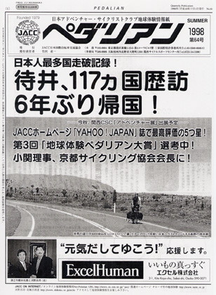 日本に帰宅して約2ヶ月が過ぎた。小松荘で写真整理などをしながら過ごしていたある日、JACC(ジャパンアドベンチャーサイクリストクラブ)の松坂さんが、自転車雑誌の取材がてら、朗報を運んできた。 「ペダリアン大賞は待井クンで決まりそうですよ。」 地球ペダリアン大賞は、JACCの創設10周年を記念して1989年に設定された。自転車旅行の普及推進に貢献した個人・団体に5年に1度贈られるもので、第1回は世界一周した台湾の胡栄華さん。第2回は小学6年生で日本縦断を果たした中務顕貴君が受賞した。今回の私の受賞は、日本人前人未踏の117カ国訪問がその理由になったらしかった。