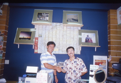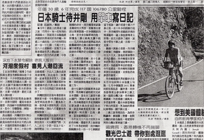 台湾 民生報と言う新聞に私の記事が紹介された。「日本騎士??」 ![]() 台湾を発つ前に、郭さんが第1回のペダリアン大賞受賞者である胡栄華さんの所に車で連れて行ってくれた。世界50カ国近くを走ったと言う胡栄華さんは、アウトドアショップを経営していた。商売は繁盛していると言う。そんな元気印の胡栄華さんと写真を撮った。