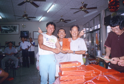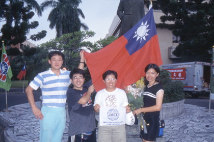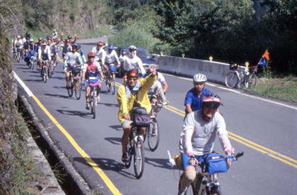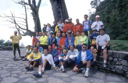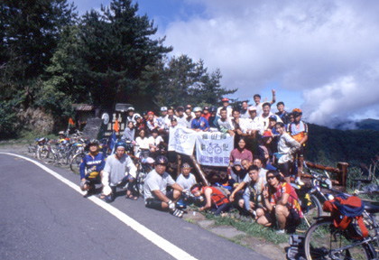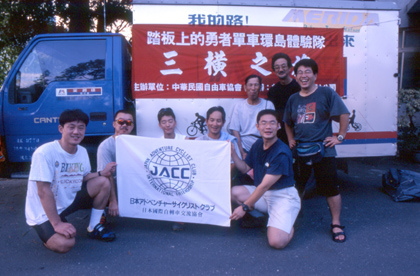 日本 地球ペダリアン大賞に選ばれたらしい・・・。 ![]() そして、ペダリアン大賞の副賞として、台湾でのサイクリングに参加して欲しいと言う。 「費用はタダで台湾へ?」 信じられない話だった。その代わりに、台湾の人と交流を図ってきて欲しいとの事。親善大使と言うと大げさだが、そんな趣旨も含んでいるらしい。 私が参加する事になったのは「踏板上的勇者活動」と言われる、年1回行われるサイクリングツアー。台湾の「自由車協会」の郭さんという方がメインで企画している。参加者のほとんどは台湾人。友好を深めるために、JACCのクラブ員ら数名が毎年一緒に走っているとの事だった。タダという言葉に弱い私は、喜んで旅のまとめを中断させ、急遽台湾行きの準備をした。と言っても期間は17日間。それに自転車は向こうで借りられるから、着替えに靴などを持って行くだけで良いとの事。当分海外を走る事はないだろうと思っていたが、帰国して2ヵ月後の7月10日、お隣の台湾を走りに行く事になった。 日本人の参加メンバーはクラブの松坂さん、藤井さん、大学生の三村さん、東京自転車センターに勤務している村山さん、それに台湾サイクリングが大好きと言う奈良の嶋村さん。 台北に到着すると、自由車協会の郭さんが車で迎えに来てくれていた。嶋村さんも松坂さんも初めてではないので、郭さんとは親しく接している。彼は日本語ペラペラなので、言葉に不自由することはなかった。ホテルに案内され、台湾料理に舌鼓を打ちながら、「踏板上的勇者活動」のコースなどを聞いた。