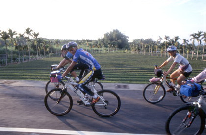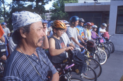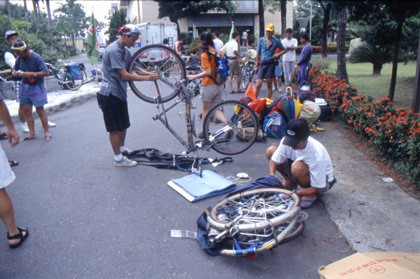 台湾 これから自転車で世界を走りに行くビッキーとピンキー(右二人)。 ![]() 会場でフレームサイズの大きい中古のマウンテンバイクを借り、ヘルメットをかぶり早速皆でサイクリング開始。一人で走った世界旅行とは違い、今回は正反対の団体ツーリング。不安な思いもなくはなかったが、とにかく一緒に走り始めた。
