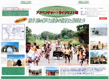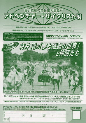 世界一周から帰国してはや4ヶ月。小松荘で雑務に追われる日々は続いていた。そんな中、雑誌の原稿の依頼がきたり、地元ラジオ局に呼ばれたりした。また、大阪でアドベンチャー展を行う事が決まり、その準備に時間を費やされるようになった。主催は関西サイクルスポーツセンター。特別出展として、「待井剛の『夢と感動の世界』と世界の仲間たち。」とあった。こんな大々的なチラシを見たので、イベント準備にも力が入った。しっかり用意せねばならない。また、10月11日はペダリアン大賞の授賞式が行われると言うので、これに合わせて家族で大阪に出向く事になった。