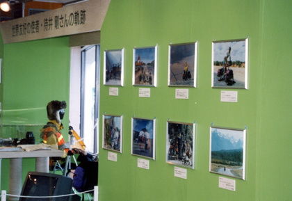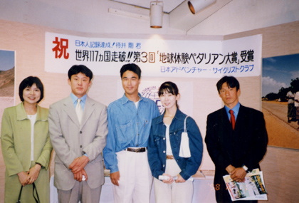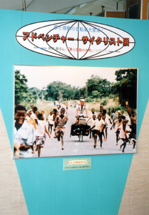 日本 旅行中に書き残した「走行記録グラフ早見表」。これも6年間で40枚になった。 ![]() 98年10月10日。授賞式には家族で行く予定だったが、後に私は別行動をする予定だったので、一人車で河内長野のサイクルスポーツセンターに向かった。そして、高校卒業してからずっと世話になっていた池本さんを訪ねた。出発以来、6年振りの再会だった。しかし、 「おう、待井君か?お帰り。元気やったか?」 池本さんは、まるで昨日も出会ったような感じで迎え入れてくれた。 そんな池本さんが準備を進めてくれたアドベンチャー展を見て回った。 「なるほどすごいなあ・・・」 拡大されたマラウィの写真や走行地図。アクリルケースの中に備品がきれいに飾られている。旅を共にしたまるでガラクタのようなボロボロの備品も、こうして飾られると生き返ったように輝いて見えた。他の仲間の写真もあったので、それらも見て回った。