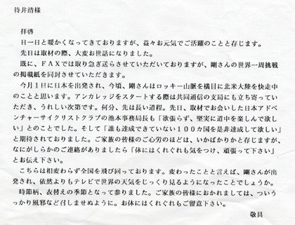 日本 10年前に訪れた関西サイクルスポーツセンターで。「世界100カ国を走破します!」そう池本さんに言った。 ![]() 無事授賞式が終わり、来てくれた人と写真を撮ったりして、その後私は家族や仲間と別れ、明石の松本さん宅に向かった。 松本さんとの出会いは10年前。自転車で日本一周をしていたとき、日本最西端の与那国島の西崎で出会った。以来、彼とは旅友達。本当にたくさんの見所情報などを教えてもらった。せっかく大阪に来たのでちょっと訪ねる予定でいたのだが、泊まる事になってしまった。我々はマダガスカル以来、懐かしく旅の話に花を咲かせた。 松本さん宅ではもう一人、懐かしい人と再会する事になっていた。それは世界一周出発の際に取材してくれた、共同通信の中西さんという記者だった。アドベンチャー展の事を知らせておいたのだが、大阪でなく、明石で会う事になった。当時から私の事を心配してくれていた中西さんは、出発間際にこんな手紙をくれた。