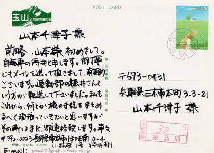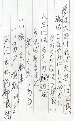 大阪で取材してくれた堀井さん。読者の感想文を転送してくれた。 ![]() 「こんな激励や励ましに何度支えられた事だろう・・・。」 そう思うと感謝の気持ちでいっぱいになり、感想文を送ってくれた、この兵庫の山本さんと言う方に、お礼の意味を込めてポストカードを送った。