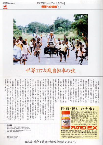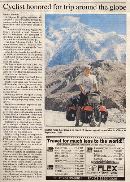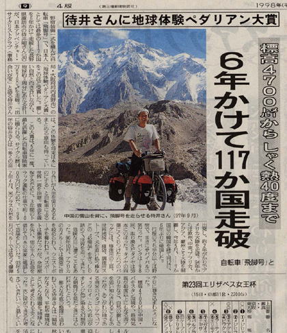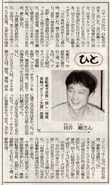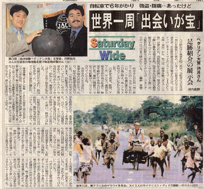 小松荘に戻った翌週、10月17日土曜日の朝7時前。霧ケ峰の山荘にいる父が、諏訪の私のアパートまでやって来た。こんな朝早くに何だろうと思ったが、朝日新聞片手に、 「ペダリアン大賞の記事が載っているぞ。」 見ると、大阪での受賞の事が載っていた。とても大きな記事だったので、私もびっくり。見出しには世界一周「出会いが宝」とある。嬉しかったのは、スイスの自転車野郎グィドが撮ってくれたマラウィの写真が使われていた事だった。 「この写真を使ってくれたんだ!」