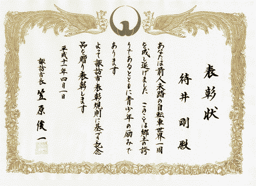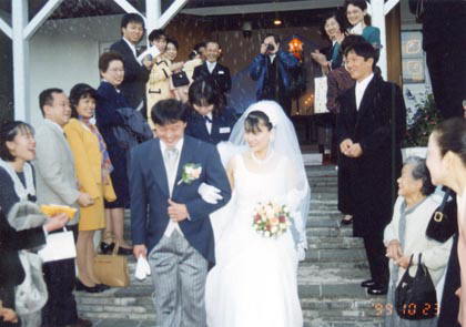 諏訪市長から表彰を受けた。 ![]() その2日後。山本さんが、兵庫から小松荘に遊びに来る事になった。私は、 「オンボロでスゴイ所だから・・・。」 とよくよく念を押しておいた。小松荘の2階の住人は犬を飼っており、毎晩、 「ガタガタガガタ・・・」 と凄まじい走りをしていたし、隣りのお姉さんも子犬を飼っていて、 「モモちゃん、いい子ねー、一緒にお風呂入りましょう。」 などと言っていた。だから、彼女がこのアパートに来たらおそらく腰を抜かすんじゃないかと思った。でも実際に私の部屋に入ると、 「きれいにしてるじゃない。いい部屋ね。」 と言ってくれたので、ほっとした。念入りに掃除をしておいたのだ。良かった・・・。 彼女に出会ってからまだ2ヶ月足らず。なのに私は彼女に自分の気持ちを伝えた。それは一生を決める大切な告白だった。彼女と会話を交わしてから、まだ50日も経っていない。ただ、交換したメールの数は400通に達していた。 唐突な私の思いを彼女は受け入れてくれた。そうなると、その後の我々の行動は早かった。5月には私の両親に彼女を紹介し、私も彼女の実家に挨拶に行った。そして、神戸でお互いの両親が挨拶をした。 世界一周から帰国して1年2ヵ月後、彼女に出会って4ヵ月後の99年の7月には入籍し、そのまた4ヵ月後の10月23日には結婚式を挙げる事になった。朝日新聞に掲載されたのが98年10月17日。それから1年後の事だった。 「まさかこんな形で伴侶を射止めることになるとは・・・。」 お互いの存在を知ってから1年足らず・・・。突然の不思議な出会いだった。でも、どこかでずっとつながっていたような、そんな不思議な思いがないこともなかった。 私たちは女神湖畔の白樺高原協会で式を挙げた。牧師さんは塩原さんと言い、私が世界一周でブラジルも走った事を告げると、牧師さんは、 「マリンガに、上田さんと言う知人がいますよ。」 と言った。 「もしかして、写真屋さんを経営している上田さんですか?」 「そ、そうです。知っているのですか?」 「ええ、上田さんには本当にお世話になりました・・・。」 牧師さんとも赤い糸でつながっていたのかと不思議だった。世界は広いようで実は狭いのかもしれない。 教会には、自転車の世界に引き込んだ高校時代の友人、小松君がいる。苦労をかけた担任の河西先生がいて、日本一周の最西端で出会った松本さんもいた。佐川急便の時の宮沢さんが家族で来てくれ、そして私と彼女を赤い糸でつなげてくれた堀井さんも来てくれた。 しばらくして賛美歌が流れると、何だか色々と思い出してしまい、また涙がポロポロ流れてきた。兄はケラケラと笑っていたが、私はとにかく嬉しかった。泣き虫なので仕方ない。情けないが・・・。