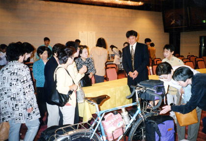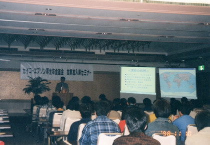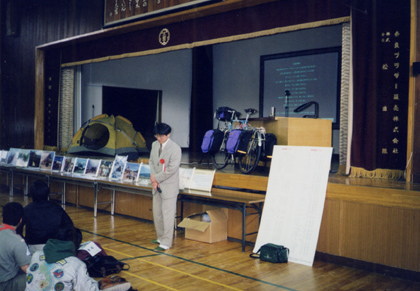 そもそも世界旅行に憧れるようになったのは、この雑誌に触発されたから。憧れの雑誌,、「サイクルスポーツ」に掲載された。 ![]() 更に、時同じくして体験談を話して欲しいと、地元企業から初めての講演依頼が入った。しかし、「講演」と聞くと、大学教授や冒険家、評論家がするお話と思っている私は、尻込みしそうになった。 「私のような自転車野郎がうまく話せるかどうか。人前で話すのは苦手・・・。」 でも断るのは良くないと思い、とにかく端から依頼は引き受けた。 「どんな事を伝えれば良いのか。」 とりあえず電子手帳を使って話す内容を箇条書きにした。中学卒業の時に受けた風変わりな研修の事。高校時代や日本一周の思い出。それに世界各地での印象に残っている出会いや体験・・・。自転車に出会ってから帰国するまでの13年間を75分にまとめ上げ、できた原稿を読んで練習した。 初めての講演と言う事で、企業の担当者の前でリハーサルも行った。ところが、いざ担当者数名を前に話し始めると、声は震え、足はがくがく。こんなに緊張するものなのかと自分を疑った。何とか「原稿棒読み講演」のリハーサルを終え、「パチパチ・・・」と、拍手をもらったが、感想を聞くのは怖かった。それでも聞いてみると、 「良かったですよ。ああいう話は面白いですね。」 お世辞でもそんな風に言ってもらえると、気が楽になった。 そして11月10日。「セイコーエプソンの加算加入セミナー」で初めて講演をした。緊張したが、本番では会場を暗くして上映をメインにしたので、意外にもリラックス。このときはスライド映写機ではなく、パソコンに取り込んだ画像を液晶プロジェクターで上映した。それぞれ2台用意してもらい、地図と写真を同時に映して、私のイメージ通りの形でビジュアルに体験報告をさせてもらう事ができた。