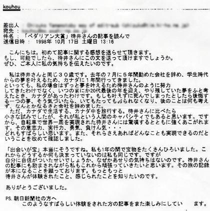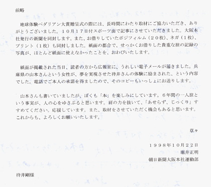 1998年10月17日(土)朝日新聞の記事(大阪本社発行)。 ![]() 昔から朝日新聞を愛読している父は、とても満足げだった。後で知ったが、記事を何枚も拡大コピーして諏訪にいる親戚中に配り歩き、霧ケ峰の山荘の部屋にも貼りまくっていたそうである。よほど嬉しかったのだろう。新聞に載ると、 「新聞見たよ!おめでとう!」 懐かしい知人からの電話があったりした。 それから数日後、ペダリアン大賞の取材をしてくれた、朝日新聞の堀井さんから封筒が届いた。中には、取材の時に渡した写真やポジフィルムの他に、記事に関しての読者感想文も入っていた。インターネットで感想文を送ってくれたのは兵庫県に住む女性だった。